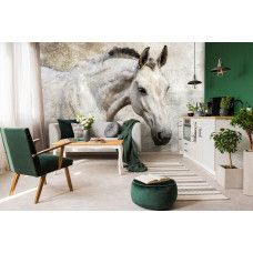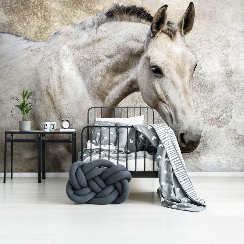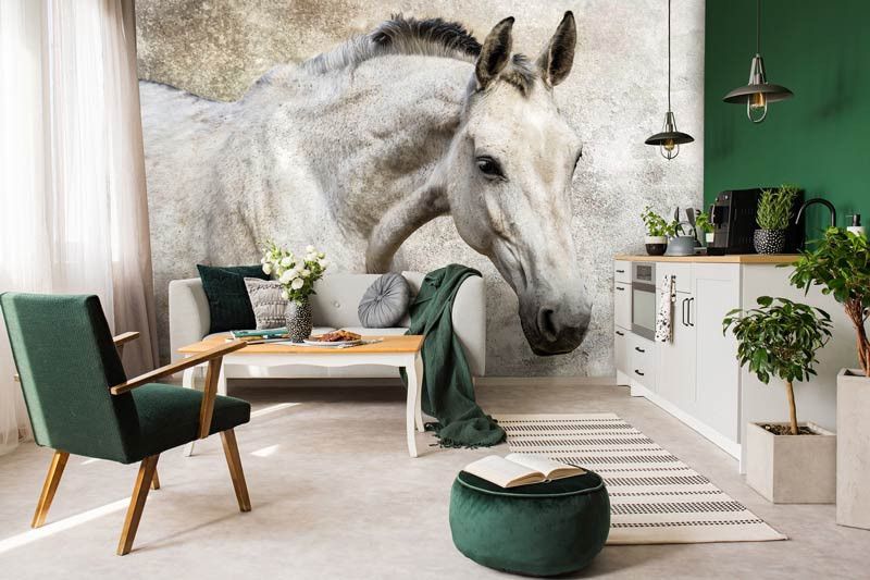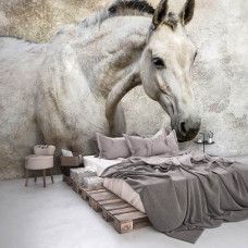 Het fotobehang van het witte paard is een echte blikvanger in de: woonkamer, slaapkamer, kinderkamer, hobbyruimte, keuken, hal, kantoor of iedere andere ruimte.
