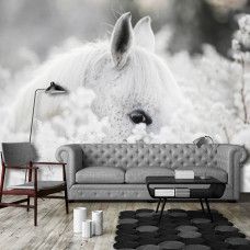 Fotobehang van een prachtig wit paard, tussen de witte bloemen, die lijken op sneeuw.