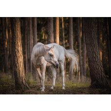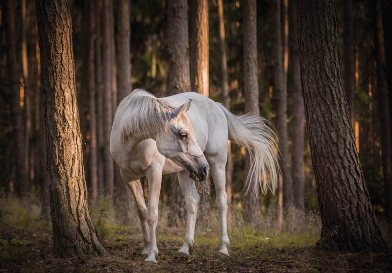 Diep in dit prachtige bos staat dit fantastiche, witte paard.
