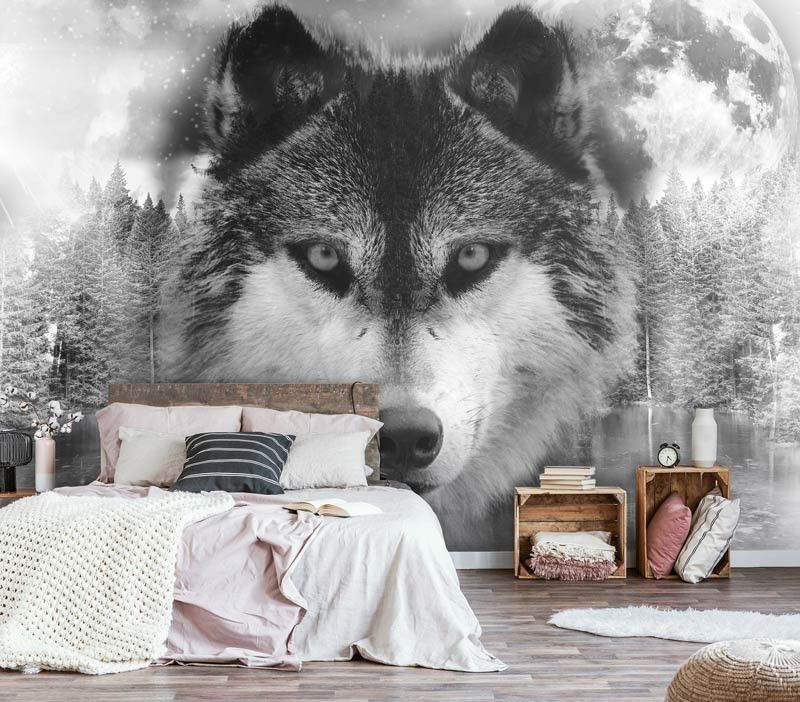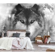 Vlies fotobehang van een prachtige wolf met zijn leefomgeving om de achtergrond, weergegeven in zwart-wit.
