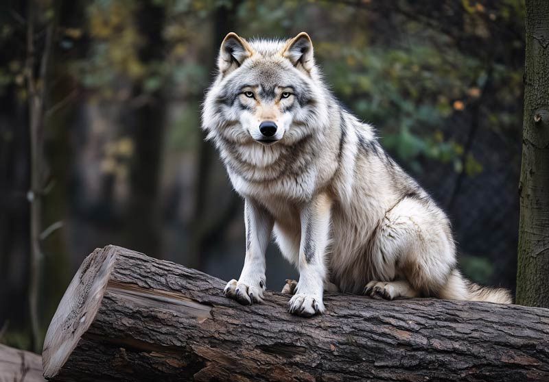 Breng de kracht en mystiek van de natuur in huis met het fotobehang wolf in het bos. Deze indrukwekkende afbeelding toont een realistische wolf die alert op een boomstam zit, omringd door een sfeervol boslandschap. De scherpe details in de vacht en het doordringende oogcontact zorgen voor een krachtige en natuurlijke uitstraling.