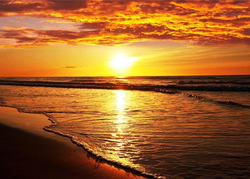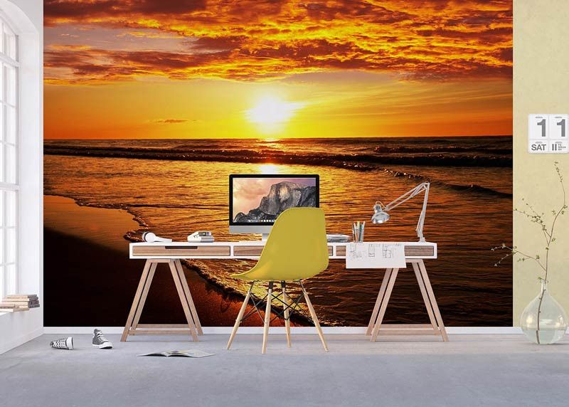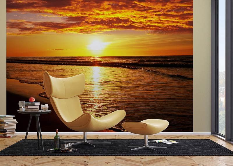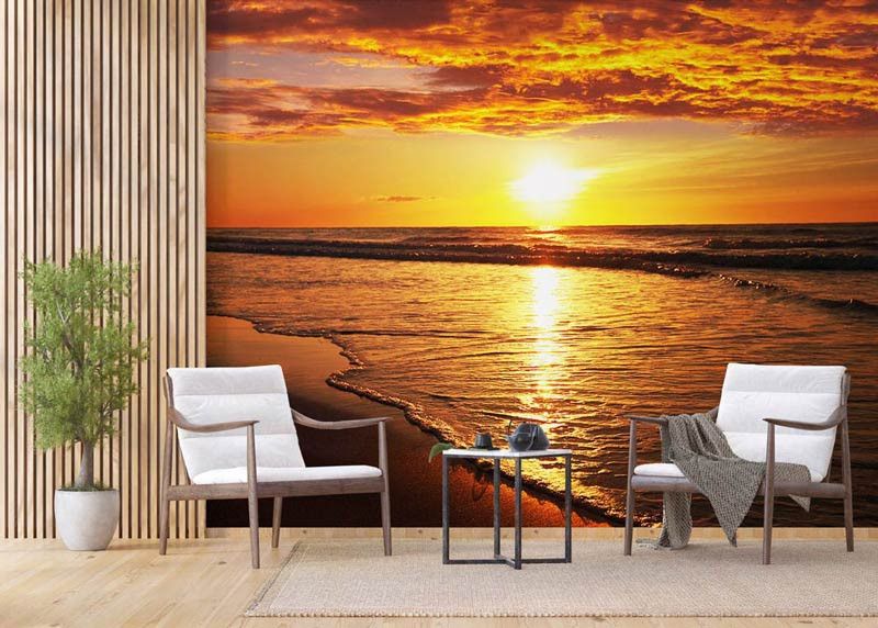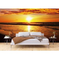 Geniet van de rustgevende schoonheid van een zonsondergang aan zee met dit fotobehang. De warme oranje en roze tinten weerspiegelen in het kalme water en brengen een serene sfeer in elke ruimte. Ideaal voor woonkamers of slaapkamers waar een ontspannende uitstraling gewenst is.