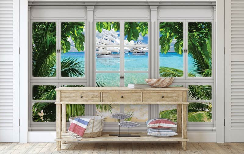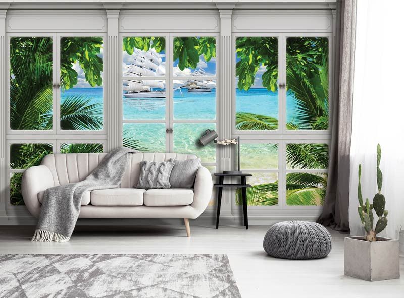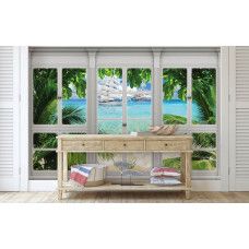 3D vliesbehang van het tropische uitzicht op de hemelsblauwe zee, gezien vanuit het raam.