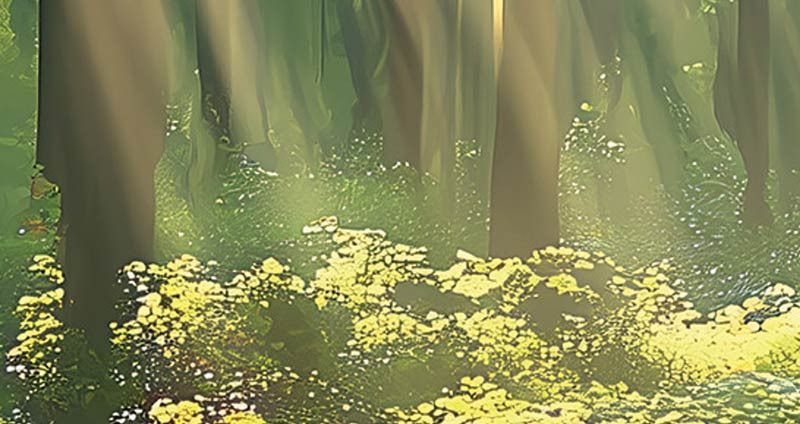 De rijke groentinten vloeien subtiel in elkaar over en worden warm geaccentueerd door het gefilterde zonlicht. Deze schilderachtige compositie zorgt voor een dromerige sfeer die perfect past in een ruimte waar ontspanning centraal staat, zoals een slaapkamer, thuiskantoor of meditatieruimte.
