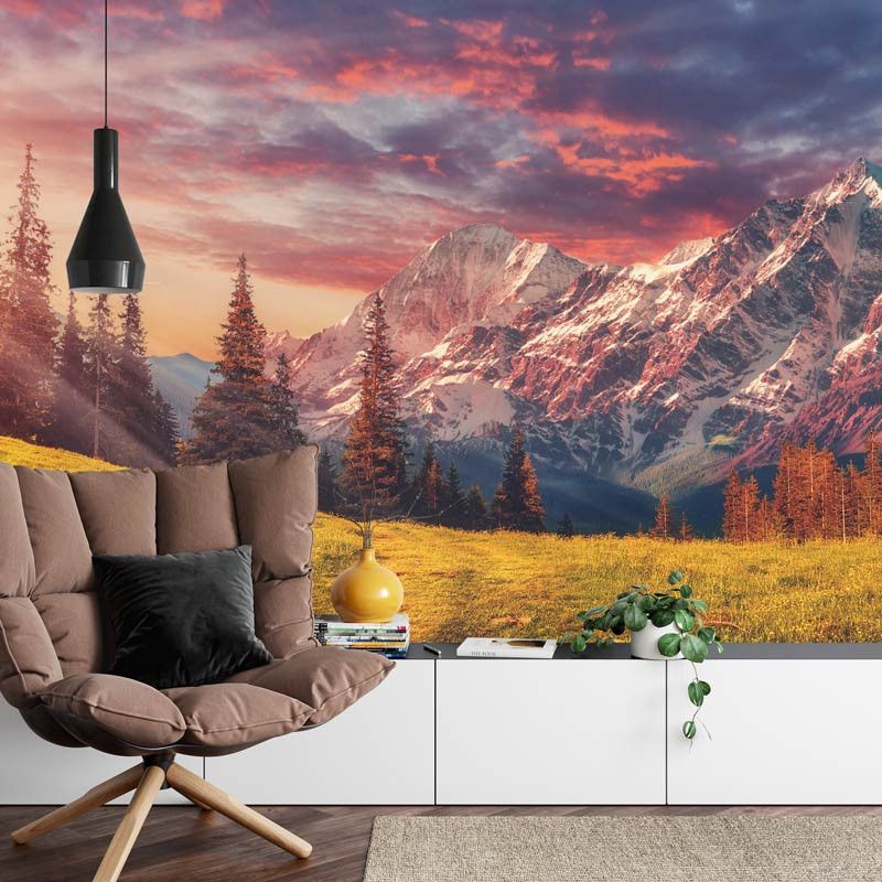 Creëer een betoverende sfeer in je woonkamer, slaapkamer of kantoor met Fotobehang Zonnige Dag in de Alpen. Laat je betoveren door de stralende pracht van een zonnige dag in de bergen, waar de lucht helderblauw is en de zonnestralen de bergtoppen doen schitteren. Ervaar de rust en sereniteit van deze betoverende omgeving terwijl je wordt meegevoerd naar een wereld van rust en schoonheid.
