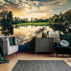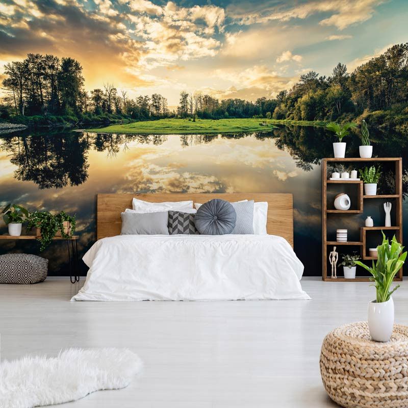 Het fotobehang van de zonsondergang aan het meer is een unieke aanvulling op elke ruimte.