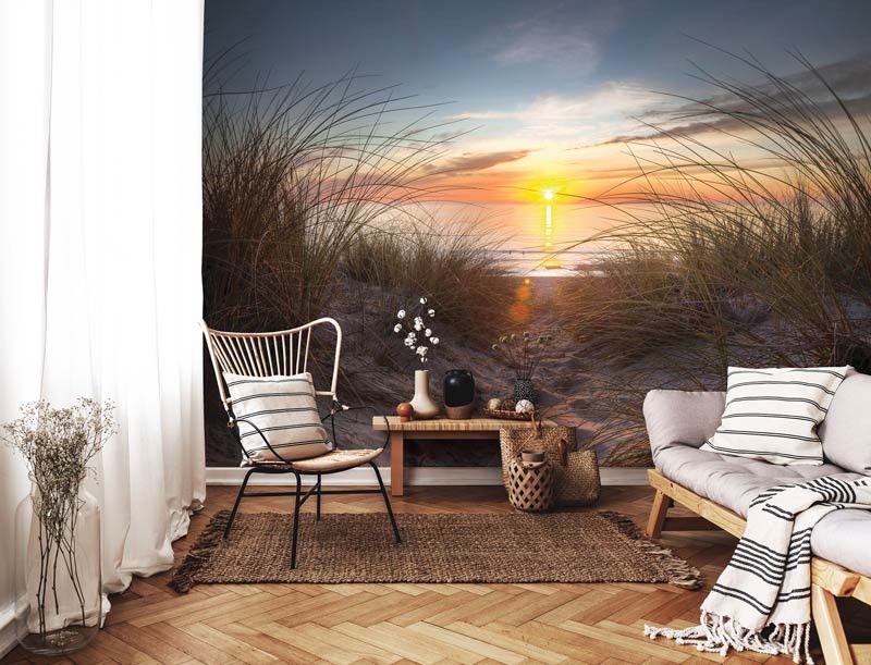 Het zonsondergang aan het strand fotobehang is een echte blikvanger en zorgt voor een unieke look in de woonkamer, slaapkamer of iedere andere ruimte.