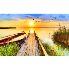 Geniet van de serene pracht van Fotobehang Zonsondergang boven de Pier. Laat je betoveren door de warme kleuren van de ondergaande zon die de lucht en het water in vuur en vlam zetten, terwijl de contouren van een sierlijke pier zich aftekenen tegen de kleurrijke hemel.