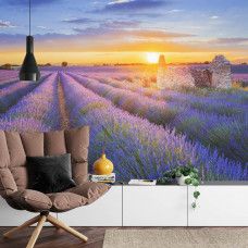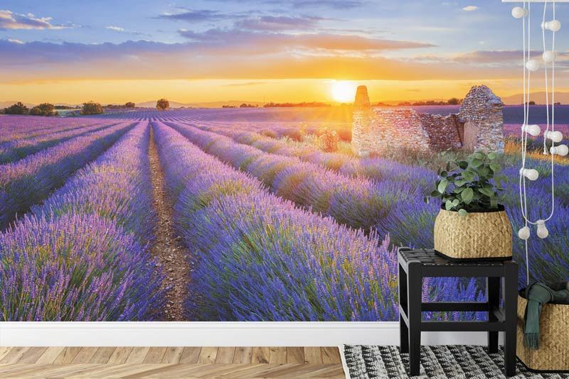 Ervaar de betoverende schoonheid van een zonsondergang boven een lavendelveld met ons fotobehang. Laat je meevoeren door de warme kleuren van de ondergaande zon die het landschap in een magisch licht dompelen.