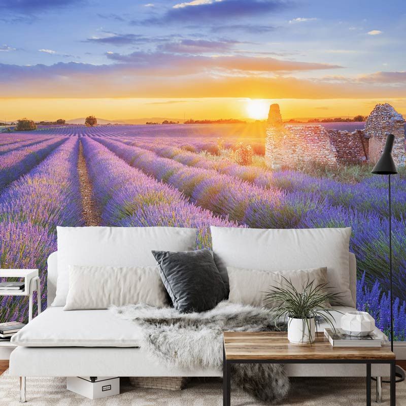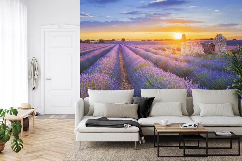 Ons fotobehang legt niet alleen de prachtige kleuren van de zonsondergang vast, maar garandeert ook een indrukwekkende scherpte, waardoor elk detail van het lavendelveld tot leven komt in jouw interieur.