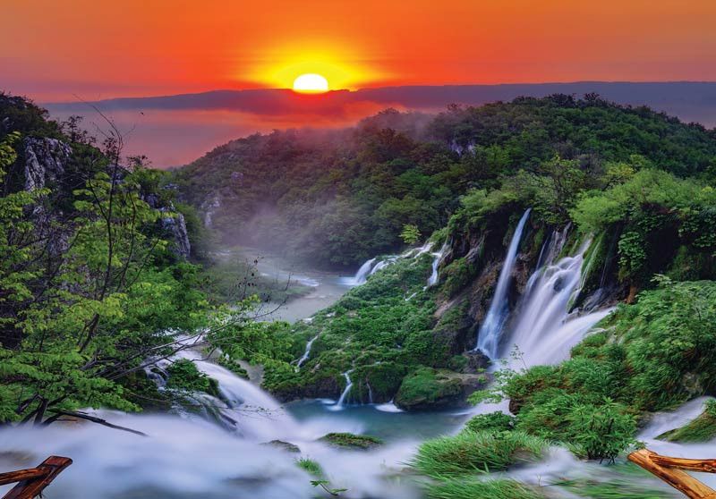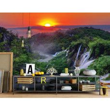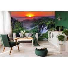 Fotobehang van schitterende watervallen in een indrukwekkend berglandschap, met op de achtergrond de prachtige zonsondergang.