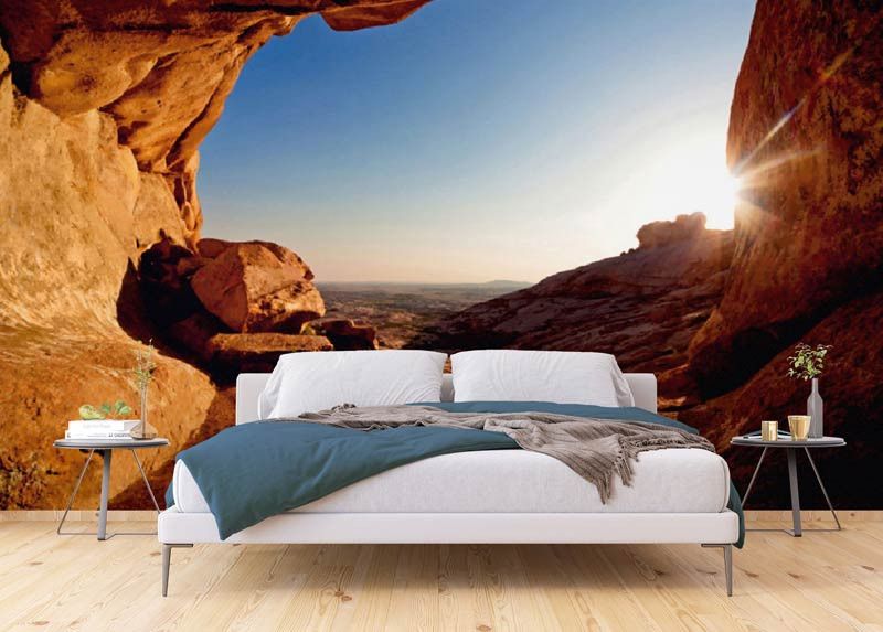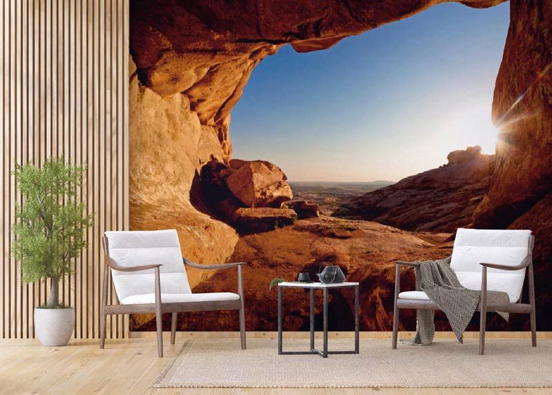 Geniet van een adembenemend uitzicht op een zonsondergang vanuit een grot met dit fotobehang. De warme tinten van de ondergaande zon en de donkere randen van de grot creëren een magisch schouwspel. De hoogwaardige afwerking zorgt ervoor dat de kleuren intens en verzadigd zijn, wat een betoverende sfeer geeft. Dit behang is op maat te bestellen voor woon- of slaapkamers.
