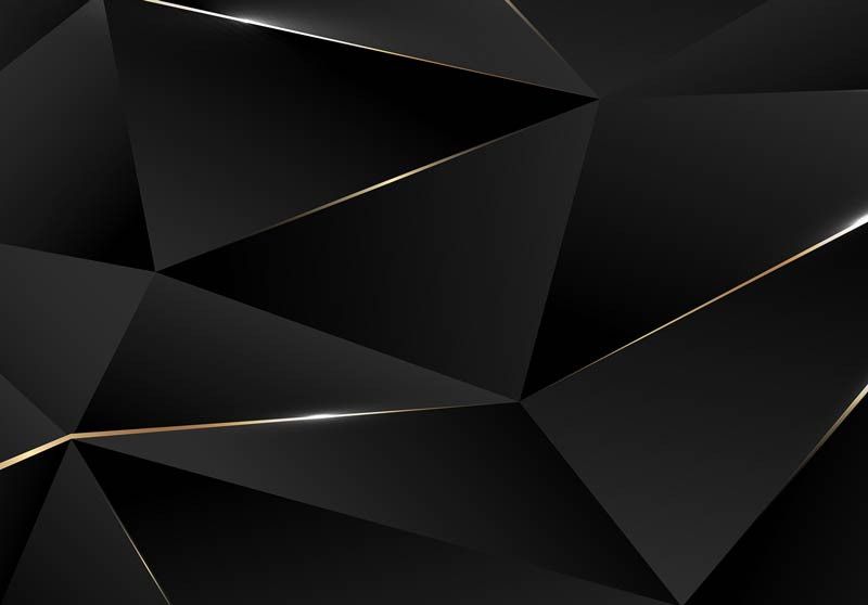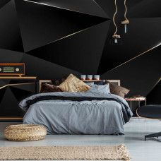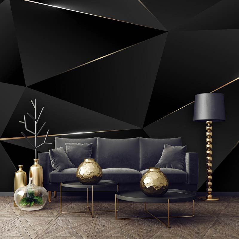 Fotobehang van zwarte driehoeken met gouden lijnen, weergegeven in 3D.