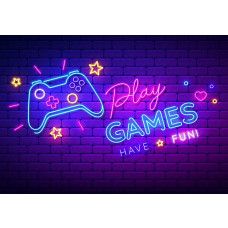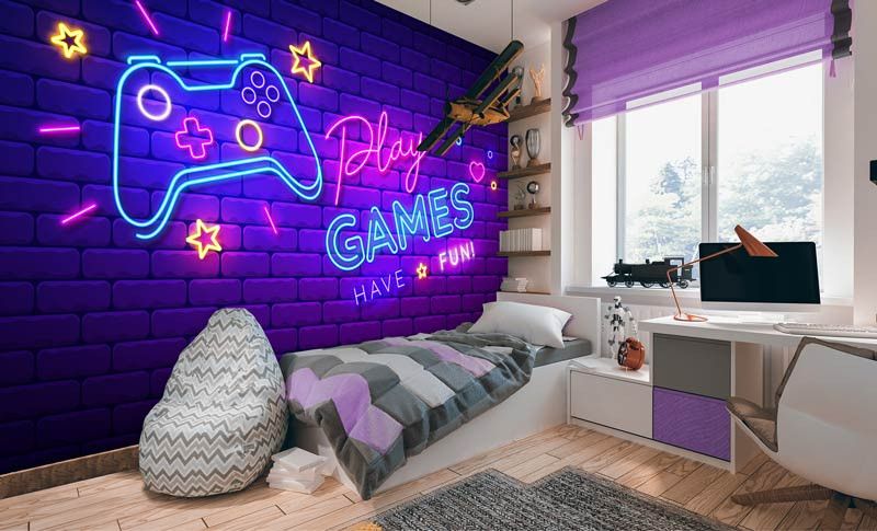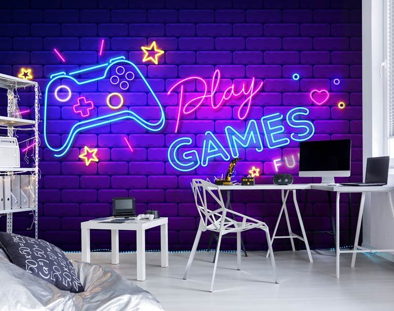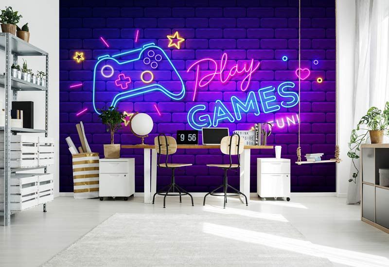 Behang voor de echte gamers. Een neon verlichte muur die nog eens extra wordt verlicht met schitterende versieringen en neonletters.