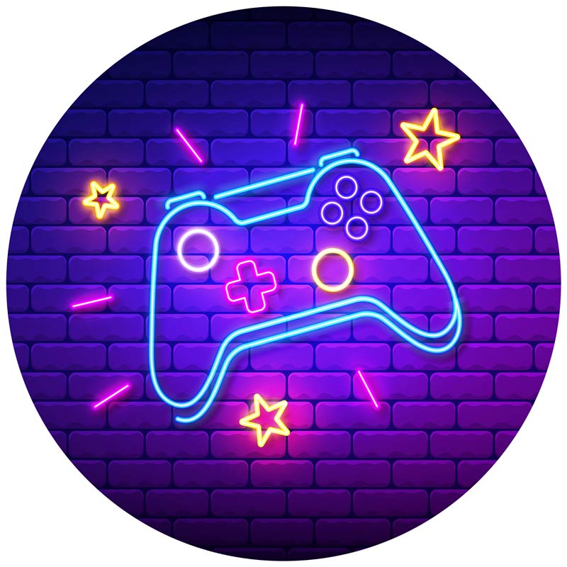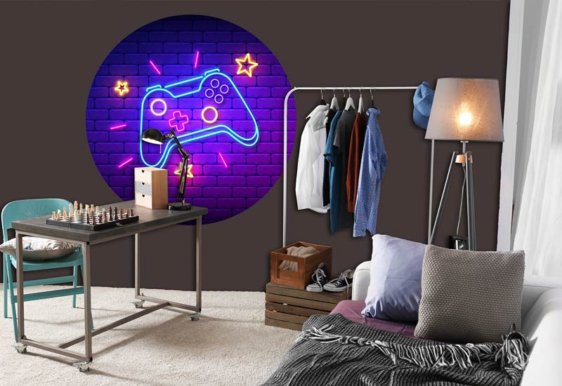 Een behangcirkel voor de echte gamers en 1 die niet mag ontbreken in de gamekamer. Een neon verlichte muur met een schitterende neon gamecontroller.