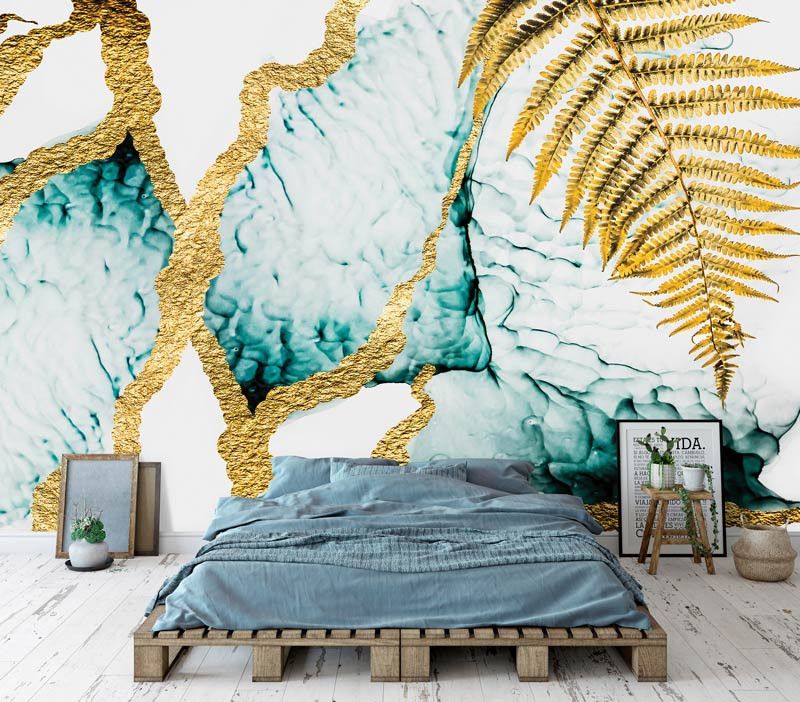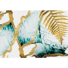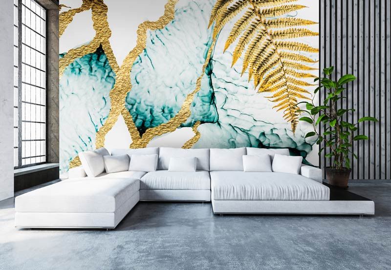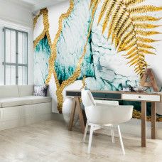 Luxe fotobehang van een marmeren muur met gouden versieringen zoals een gouden varen. Marmer fotobehang is tegenwoordig erg populair omdat het nauwelijks van echt marmer te onderscheiden is.