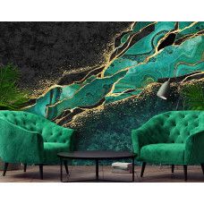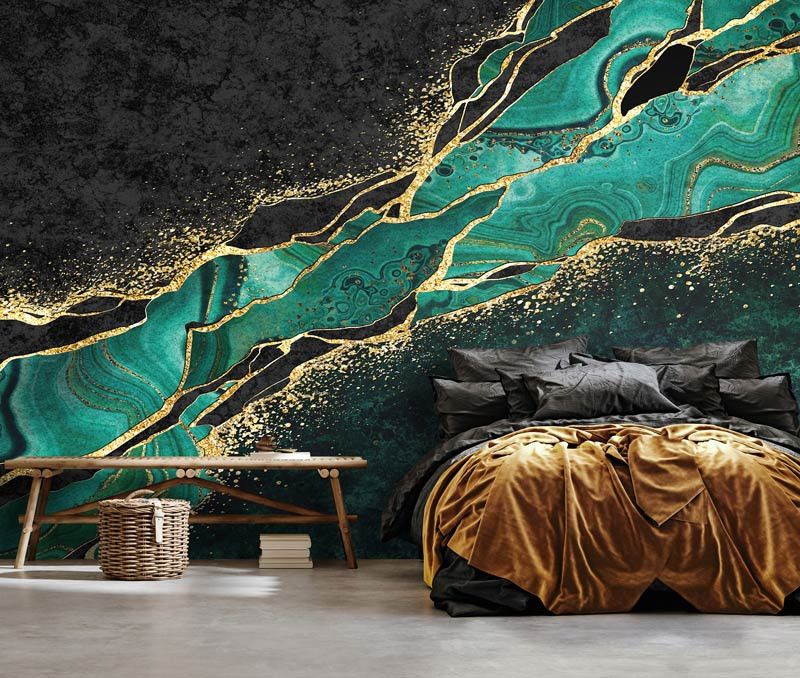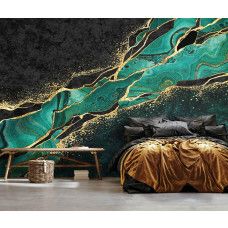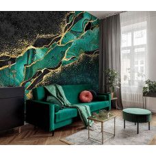 Marmer behang in groen en goud. Marmer behang is tegenwoordig erg populair omdat het nauwelijks van echt marmer te onderscheiden is.