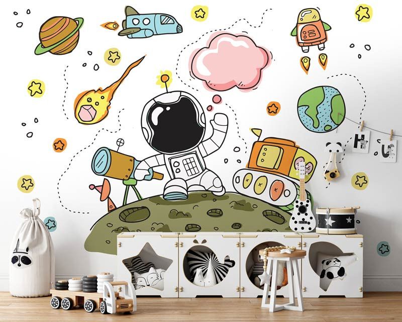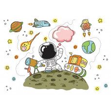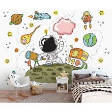 Dit kinderbehang is speciaal ontworpen voor kinderen die gefascineerd zijn door de ruimte en alles wat daarmee te maken heeft. Het fotobehang toont een prachtige afbeelding van een astronaut, omringd door kosmische elementen zoals planeten, sterren en raketten.