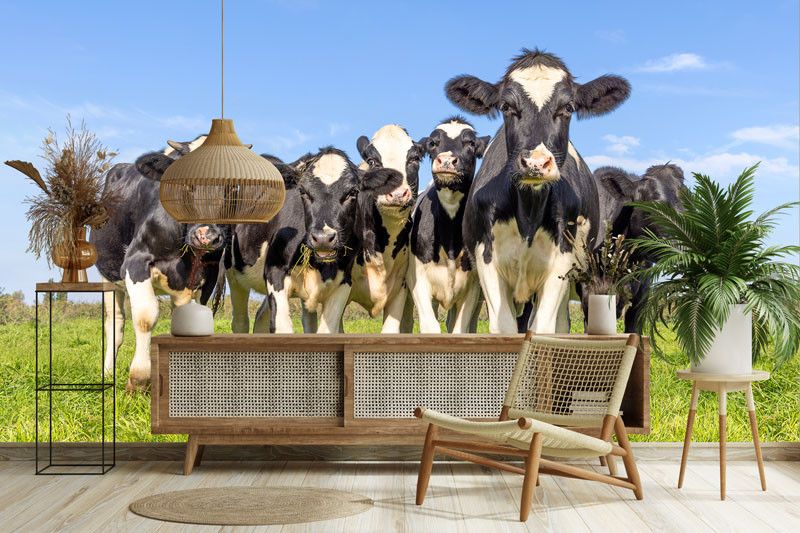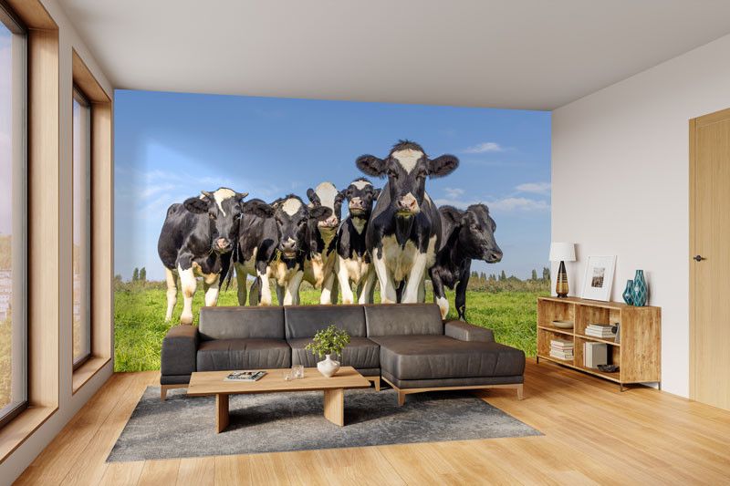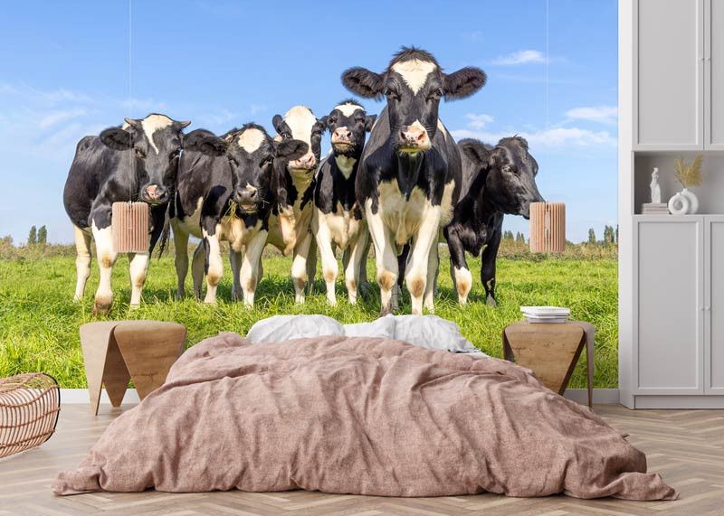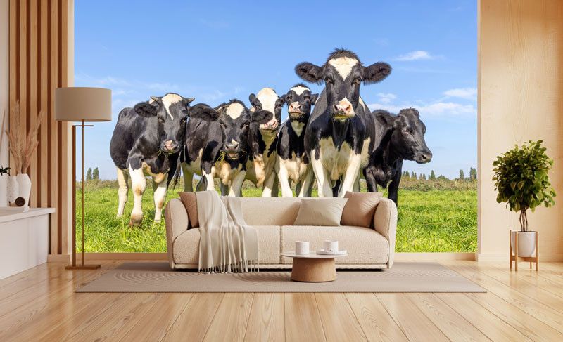Dit koeien behang toont een groep zwartbonte koeien die nieuwsgierig in de camera kijken, staand in een frisgroene wei onder een heldere blauwe lucht. Het perspectief op ooghoogte zorgt voor een levendig en natuurlijk beeld dat direct de aandacht trekt.