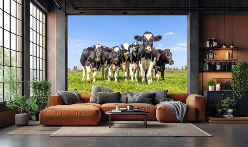 Koeien behang past perfect in een landelijke woonkamer, keuken, hal of zelfs in een kantoor met agrarische uitstraling. De frisse kleuren van het gras en de lucht brengen ruimte en licht in het interieur en zorgen voor een ontspannen boerderijsfeer.