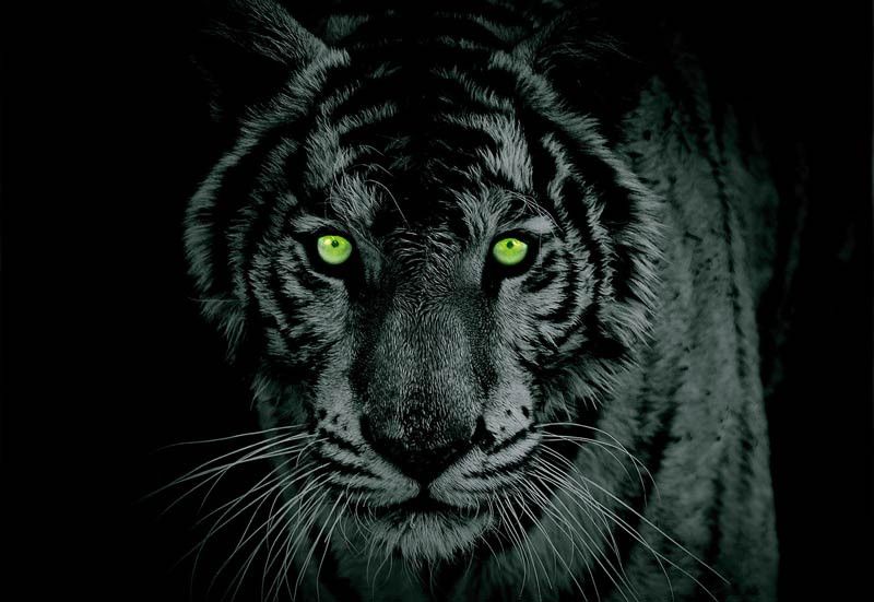 Fotobehang van een prachtige tijger met heldergroene ogen.
