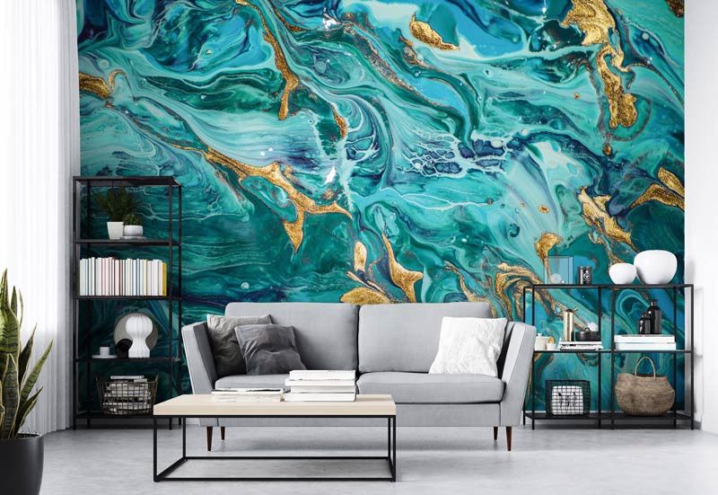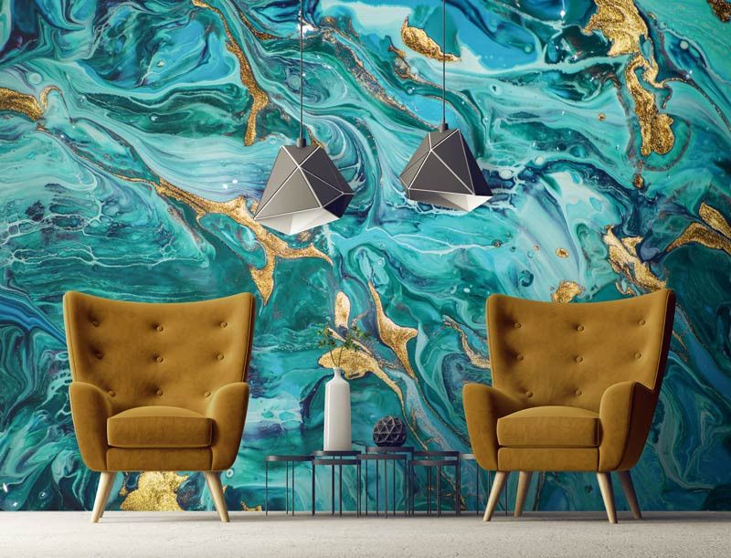 Turquoise en Goud Marmer Behang